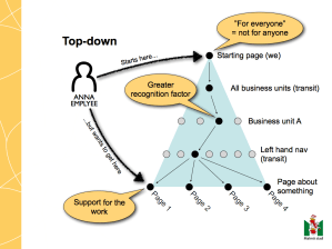 Today, we always try to have a bottom-up perspective when structuring content on the intranet. It’s about turning the pyramid upside down, about delivering the pages that provide support for the work as quickly as possible. Anna employee should not have to cut through a variety of about-pages and transit pages to get the answers she look for.