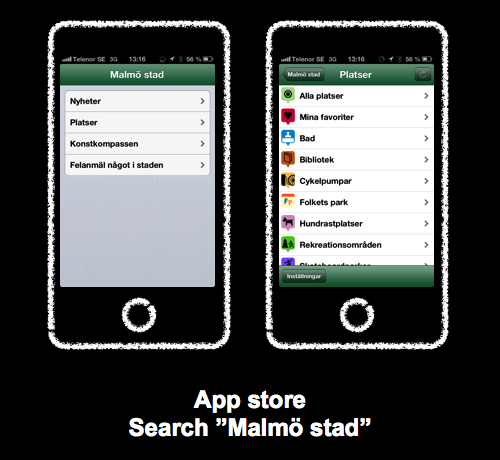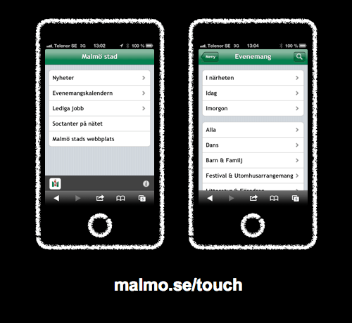 City of Malmö has developed a native iPhone app for citizens. Go to the iPhone app store and search for “Malmö stad” for a first hand look. Update: The Native app has been deprecated.
