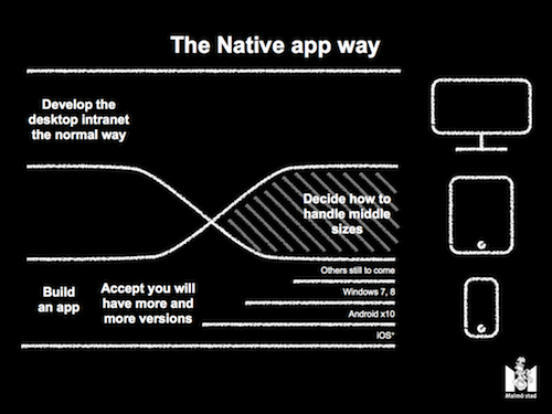 - And—maybe the biggest problem with a native app—you actually have to build and support several apps, at least one for every smartphone OS. Or skip support for small OS ecosystems? Tablets also add to the complexity. Or should tablets use the desktop intranet? Decisions, decisions.