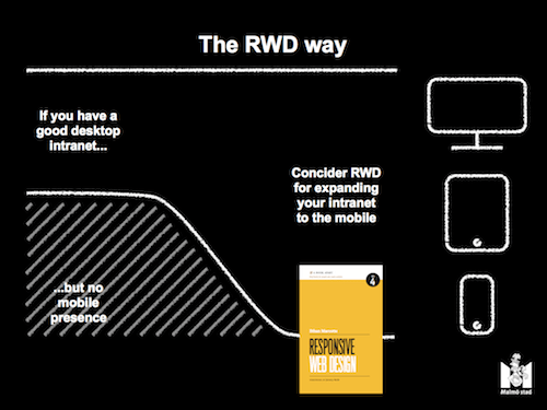 We at City of Malmö really like RWD and we think this is the future. This is the way to go if you think you already have a good intranet with the right content and services. You will have only one intranet to care for, found at the same address no matter what browser and device you use, and no one will ever ask the question why you can do some stuff in one device but not the other. (Get this bible as well: Responsive Web Design, by Ethan Marcotte.)