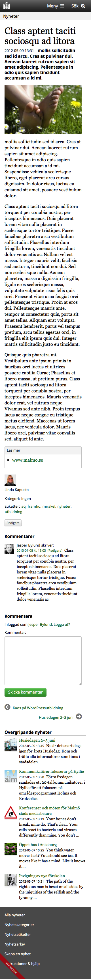 The big change on the news pages is that the right column is greatly shortened compared to the September iteration. It used to have more than 30 links (5 more news blurbs based on categories for the news item on the page, 4 help links, 10 latest comments, 12 archive months), but now it only has five “further reading” links. These five blurbs are community-wide “Our municipal news”, relevant for everyone.