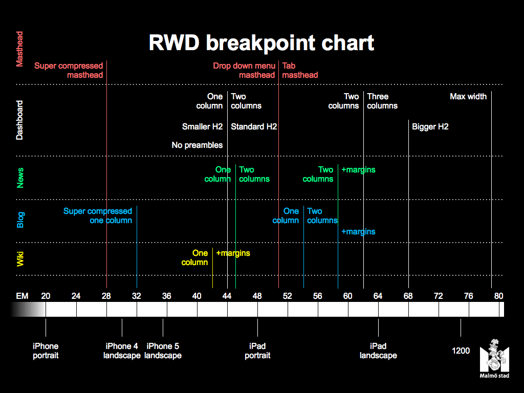 Below a chart describing our breakpoints. As you can see the breakpoints occur at many different places and also individually depending on content type—we just insert them whenever we feel we need to change the design in order to make the individual page look good.