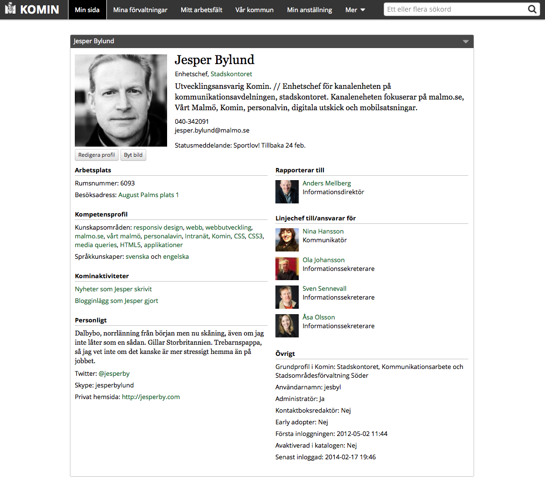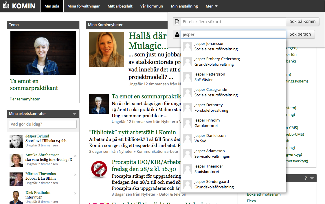 I have for some years wanted to change City of Malmö’s way of finding people into something better, into a more user friendly solution. Until now the way for looking up a person in the organization has been rather cumbersome. A database separate from the intranet with a problematic UI, data about a person hidden away in hard-to-navigate expanding views, only surname search, few and wrong tags/keywords on people, no photo, no self-service edit of your data and less than 50 percent of the employees in the database.